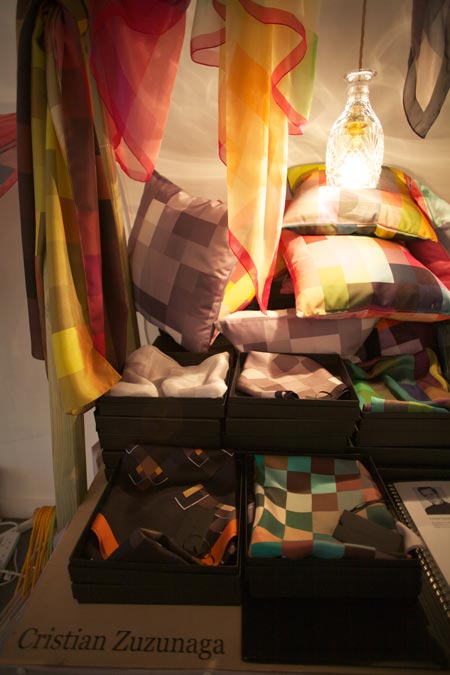 写真上:Cristian Zuzunagaデザインによる模様のついた絹のスカーフとクッション