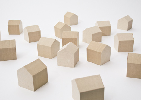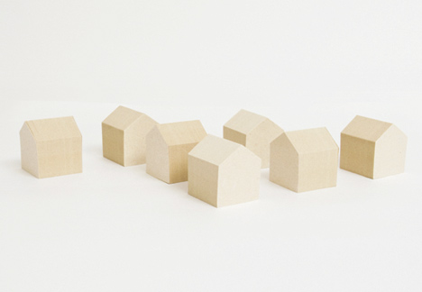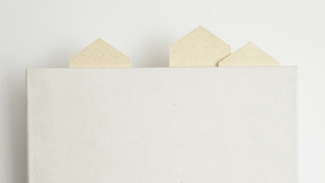 「IE-tag」というこの切り妻屋根の家の形をした付箋ブロックは、机上でもしくは本の端で小さな村を表現する。