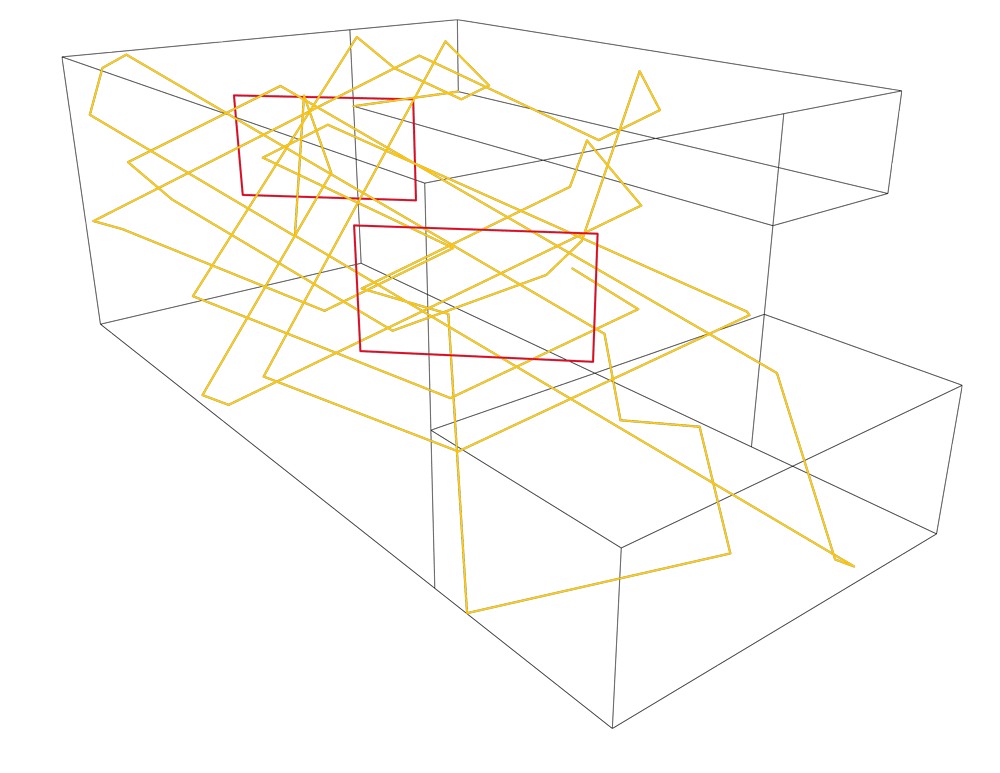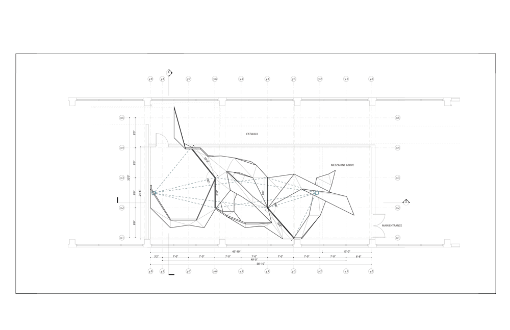 ギャラリーのスペースをグリッド枠と考え、一本のベクトル線をデジタル処理で弾ませて、この角度のある幾何学的な形状が作られた。