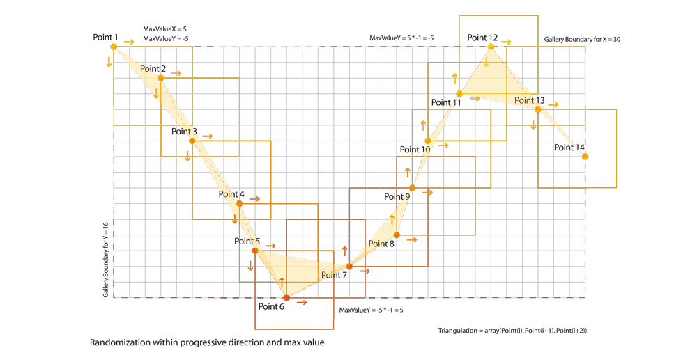 このマトリクスでは、無作為に16のベクトル線が作られ、それぞれ3番目のベクトルの先端が三角形の起点に向いていることで、連続したカット面が作り出されます。