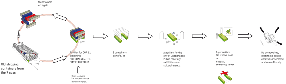 展示中のコンテナにさえ、簡単に新しい命を吹き込んで、もう一度コンテナとして生まれ変わる事が出来るのです。その柔軟性が示す様に、コンテナを2つに分けて、別々に使用する事が出来るはずです。彼らの可能性は、無限です。近い将来、コンテナで出来た住宅や、セカンド・ハウスもコンテナで作る事が可能になり、自然に優しい社会になるでしょう。この展示会終了後、コペンハーゲンは文地元のイベントやコンサートの舞台用にコンテナ2つを使用する予定です。
