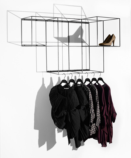 棚は鋼鉄の棒で出来た頑丈なフレームで、組み合わせると長さ、幅、高さがそれぞれ360mmの小さな立方形の集合体になります。構造に立方形を取り入れることで、一番下の衣類は、壁と直角にしたり、90度回して壁を背に服の前面が見えるような、2通りの掛け方が可能なのです。