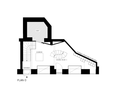 「その構想は、鮮明な輪郭上にらせん状の階段を2つ組み合わせて、基本的な形を作ることでした。商品を陳列するという機能面での必要性から、らせん形を取り入れる段階で、階段を変形させましたが、それによって独特な雰囲気が生まれました。」