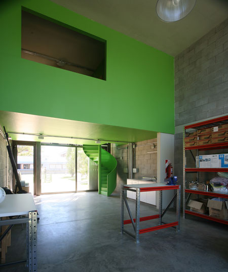 スライド式のガラス・パネルによってスタジオは広場内に結合され、外装は穴のあいたメタルの折りたたみ式シャッターが特徴となっている。