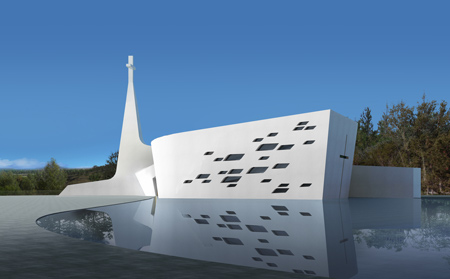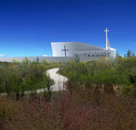 教会はコンクリート製で、正面玄関にはクレピーの外装材を使用しています。躍動感溢れる建築は、カーブを描いて敷地を横切る道路に沿うように建てられています。