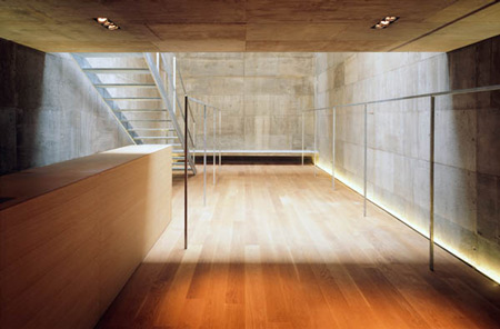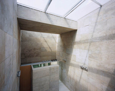 このコンクリートの建築は完全に外部からの光をシャットアウトし、しかしその一方で天井のスカイライトから十分な光が内部へ差し込むようになっています。