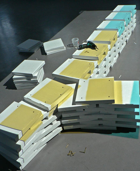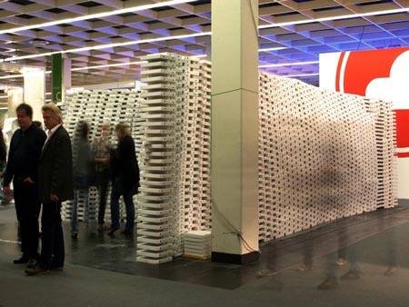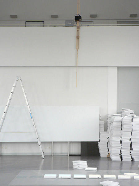 変形した壁は極度に密閉された空間を生み出し、活気に満ちた周囲の通路から隔絶されます。この空間の中央にはプロジェクトの記録として、トリーア専門大学と企画に関わった学生たち、さらにインスタレーション本体の完成までを追った簡単な写真が、巻き取り機を使って縦に展示されます。