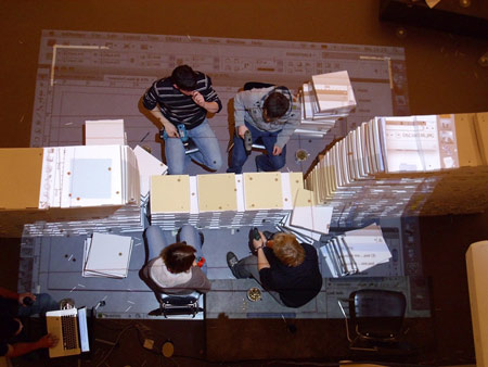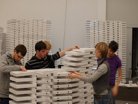 学生たちにとって組み立てが容易であり、また解体後の処理がしやすい点を考慮して、私たちはハイテクなデザイン構築技術と、リサイクルが容易なローテク素材である「ビザの箱」という対照的な組み合わせを考案しました。ごくありふれた素材が少しずつ向きや形を変えながら積み上げられることで、美的感覚が強調されていくのです。