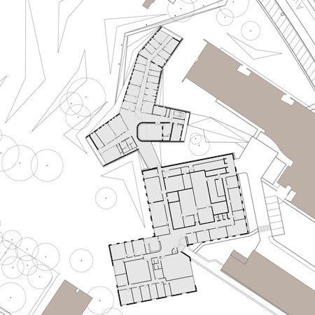 交差した図面に基づいて設計された規則正しい自律的形状は、それぞれのウィング内に異なる計画のもとに作られた構成要素を抱え、それらは方位、近接性、供給といった機能面での基準により分断されています。