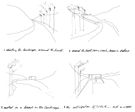 建物自体は、山々を望む優れた視界と、この住宅に内在する公私を明確にした空間的構造の両者を追求する「枠」としての機能を果たします。これは主として建物の正面と裏側の外壁処理により実現されます。