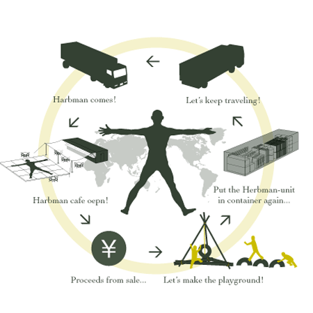 海を越え、広く沢山の人々に伝播する目的も持ち、必要な全てのキットを、航海も可能なコンテナに積み、世界各地を移動しながらプロジェクトを展開していきます。コンテナにはハーブマン制作キット、簡易キッチンとカフェユニットなどが積まれています。開催地でそれらを出して組み立てて、 ハーブマンやカフェを作ります。コンテナそのものはカフェの空間になります。一定期間の運営を終えると、それぞれのアイテムは再びコンテナに収納され、次なる場所へ運ばれていきます。