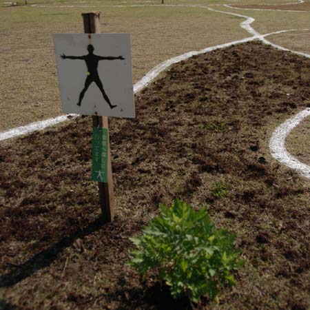 日本有数の温泉地(国際観光文化都市)大分県別府市で開催されたMHCPは、ハーブマンは全長60mに及び、グラフィカルに表現されました。広大な敷地に、ハーブマンマップ(部位で区切られた人型のどこに何が効くか図示されたもの)が巨大に描かれました。このように、ハーブマンの表現方法は旅先の地にあわせ様々に展開されます。各部位に効く薬草がそれぞれ1株ずつ、参考に植えられていて、その横に薬草の効用が書かれたカードがかかっています。それはオーダーカードになっていて、人々は巨大なハーブマンの上を歩きながら、体のどの部分に何の薬草が効くのか理解し、自分が飲みたい薬草のカードを選ぶことができます。選んだカードをバーカウンターに持って行くと、カードと薬草茶代と引き換えに、薬草茶が提供されます。ところどころ、オーダーカードではなく、「草原に探しにいっています。」などハーブマンのメッセージが書かれたメッセージカードがかかっている部分もありました。