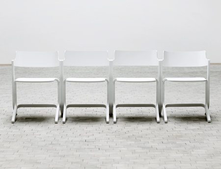 横につなげて並べることで、薄い板で出来た「橋」が完成します。この椅子は積み重ねが簡単で、従来の椅子と異なり2脚で出来ているため、テーブルの端にかけることで(室内の)掃除が容易にできます。
