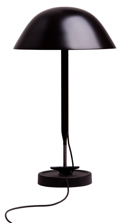 この単純な形のランプは、釘や画ビョウのように単純かつ頑丈であることを意図して、作られたものです。従来型の工作機械照明同様に、伝統的な工業的要素を改善しつつ、頑丈で長持ちする構造となっており、止め具部分は使い勝手を考えて反転されています。このランプは、頑丈さと軽さがミックしています。薄いはりがランプの2対の対抗部分をつなげ、どっしりとした鋳造製の台が繊細な傘を支えています。このシルエットと様々なポジションが、まるで小さな傘を思わせます。