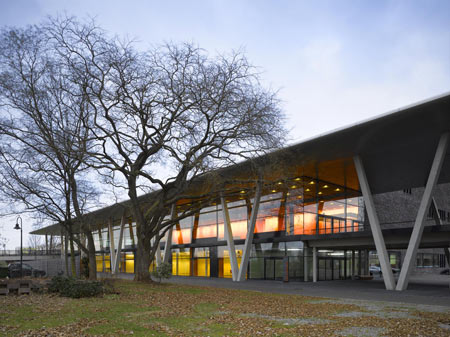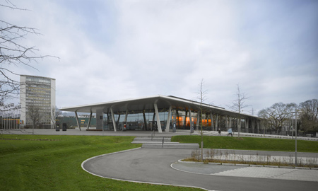 Ein neues, gläsernes Foyer verbindet die Oberrheinhalle mit der vorhandenen Ortenauhalle und bildet damit das neue Veranstaltungszentrum Offenburg.