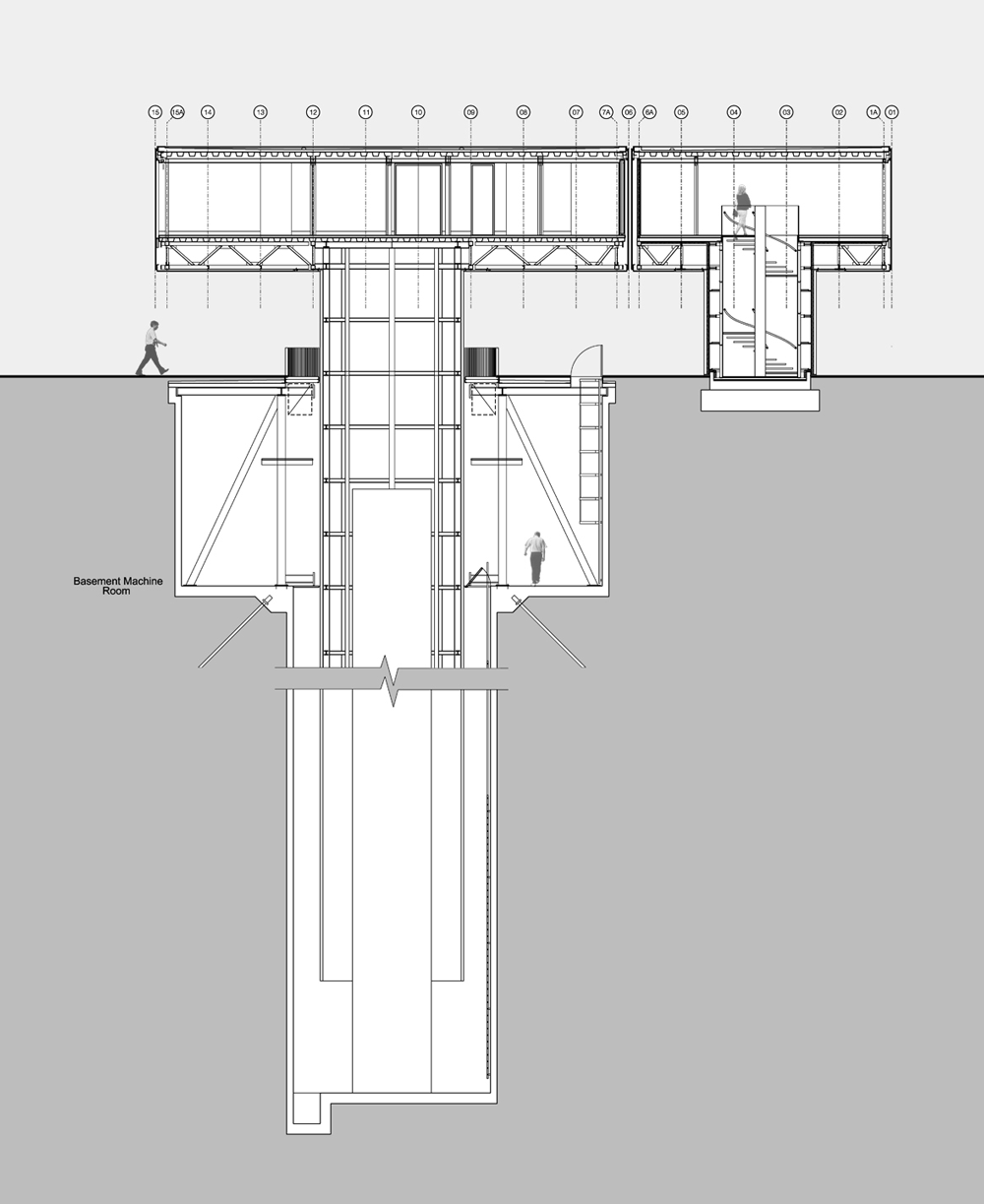ヴィラの支柱と可動部分は、枠台に吊り下げられ押さえとして機能する260トンのスチール・プレートによって均衡を保ち、中央内部のスチール・チューブ構造内で導かれ、エネルギー効率の良いセダン車に匹敵する22キロワットの駆動モーター8基によって可動します。