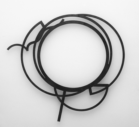 この展示会で注目すべき点は、ワトキンズ氏が紙や金、さらに工業用原料である鋼鉄、アルミ、チタンなどの素材を斬新な発想で使用していることです。作品は年代順に展示され、初期のモノクローム作品から始まり、ジャズの影響を受けた1980年代に制作されたものは、ネオプレインで装飾された鋼鉄製のフレームが何重にもなって装着する人の体に巻きつく特色ある作品になっています。1990年代になると、金と優れた金細工の技術を再び取り入れた作品が主流になり、同時に自然や幾何学模様の影響を受けたより素朴な作品もいくつか展示されます。