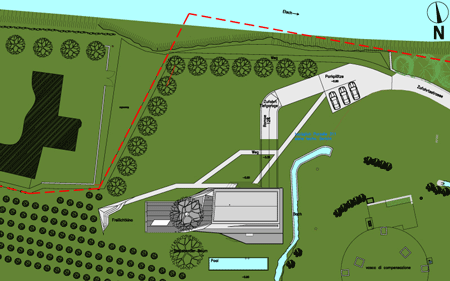 このプロジェクトの中核を成す構想は、二本の木を保存し、その内の一本を建物の構造の中に組み込むことでした。そのようにして組み込まれた空間は、「緑の中庭」となって建物を2つに分離します。依頼主の要望により、一方が住居に、もう一方が写真スタジオになります。住居の部分は上下二階に分かれ、上下の棟を僅かにずらして設計することによって、下の北側は玄関の天蓋に、上の南側はテラスになります。