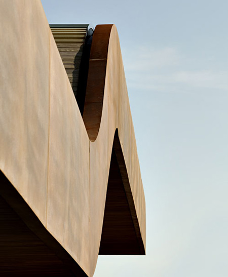 緑、茶、黄色の金属板で覆われた外壁全体も、建物に視覚的な統一感を与える要素の一つであり、これにより周囲の景観との調和が図られます。水平に金属板を重ねた外壁には、野菜と木材やベニヤの色を交互に組み合わせます。この外壁は野菜の色を使用することで周辺の畑と調和し、同時に熱障壁の役目も果たします。