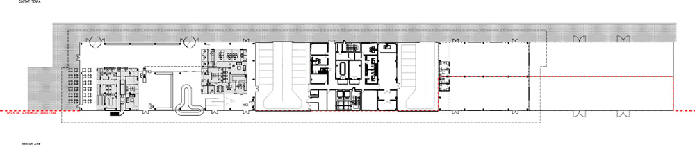 基部は幅22メートル、長さ28メートル、高さ4.4メートルの建物です。ここにはロビー、数か所のオフィス、会議室、さらに倉庫が収納されます。基部に当たる1階は、第一ターミナルや他の付属施設と合体します。基部と管制塔は、垂直にせり上がった外壁によって結ばれます。