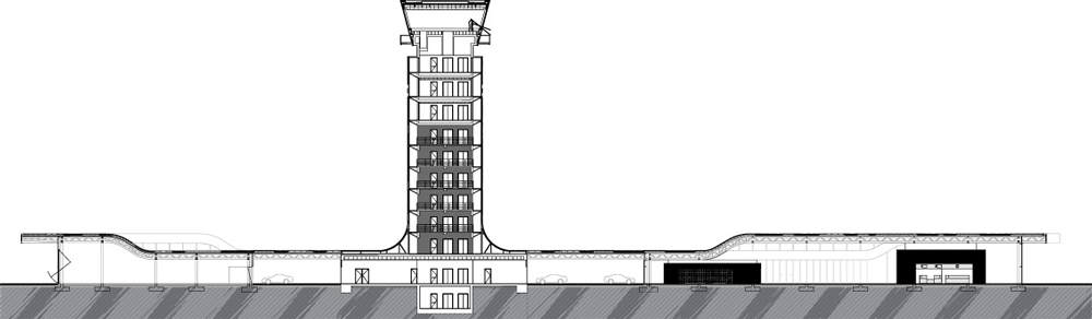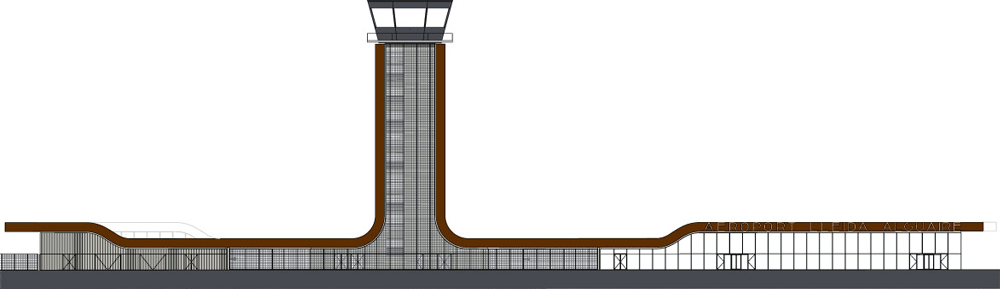 両側の外壁は、建物の見える部分(基部の屋根と塔の両壁)をほとんど包み込む広い毛布の役目を果たし、これによって建物全体に統一感が生まれ、将来、空港敷地内にある他の施設と一体になります。