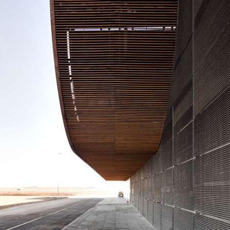リェイダ・アルガイア空港の敷地内にあるこの建物は高さ41メートルで、コールテン鋼で縁取りされた基部の屋根が、這い上がるように管制塔の両壁となって伸びている。