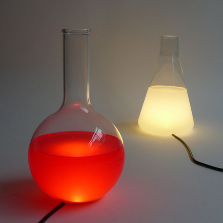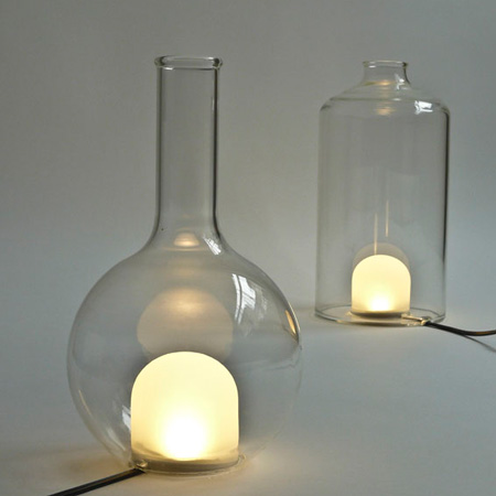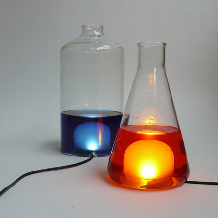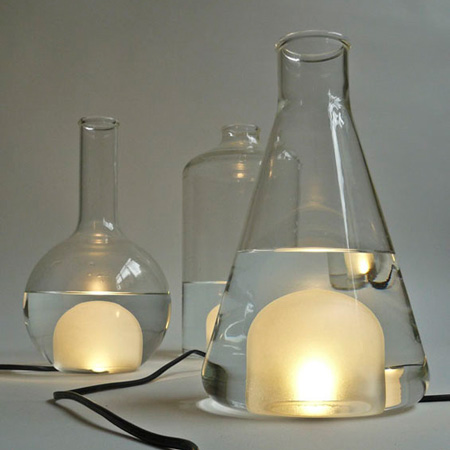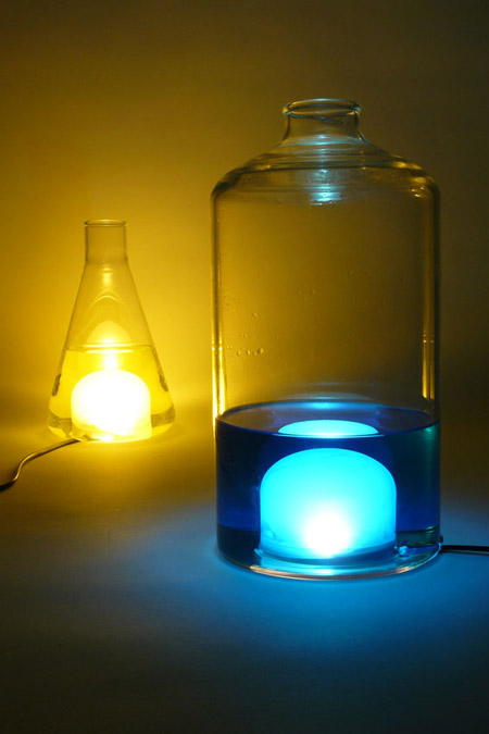 ベルギーのデザイナーMaarten De Ceulaer 氏が今月ミラノで発表した照明器具類は、内側のビンの中に食品着色料で染めた水が入っている。
