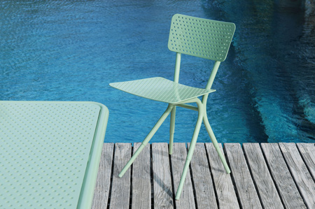 テーブルと椅子の脚は下に向かって細くなり、多数の丸い小さな穴が開いた表面のデザインによって、水はけがよくなる。
