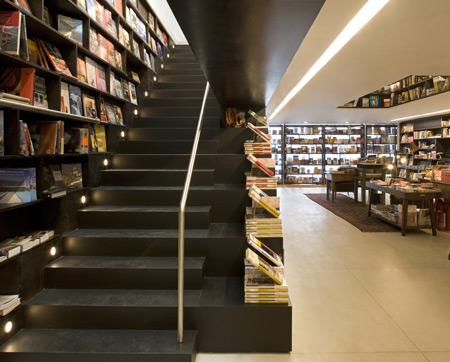 Livraria da Vilaにおけるそのような快適な環境作りは、天井を低くした空間、落ち着きのある色や照明、さらに床から天井まで延々と伸びる一見無秩序のようでありながら配慮が行き届いた書棚に反映されています。