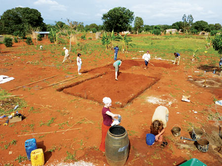 ノルウェーの ベルゲン建築学校の学生たちが、モザンビークの村で砂袋、瓶、草を使った校舎を建てた。