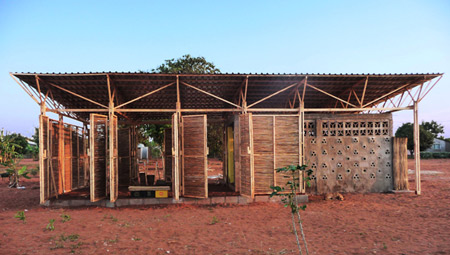屋根は雨水を貯水槽に集めます。波型の鉄板で出来ていて、低コストの手製の藁の束の上に載っています。わらの束は室内を冷やすための自然の通気孔を作り出し、地元で安く調達した藁のマットで作った室内屋根が、熱風を外に出してくれます。