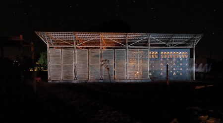 日影のある南側のファサードには、光を通し埃を中に入れないためにガラス瓶が使われています。瓶は美的な質感を与え、高価なガラス窓に代わる良き代替品となっています。