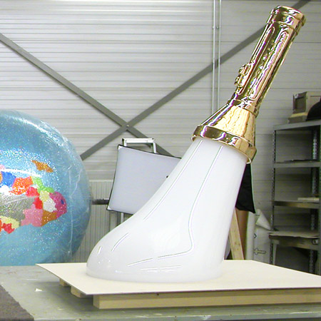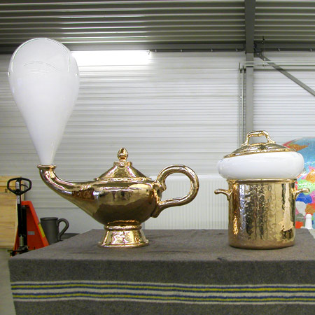 「不思議なランプ」と呼ばれる7つの照明オブジェは、スタジオ・ジョブの作品である拡大された家庭用品や容器(Home WorkとFarmのプロジェクトに関する以前の記事を参照)とベルグマンズ氏の手吹きで膨らました電球の「Light Blubs」シリーズ(関連記事はこちら。)が合体したもの。