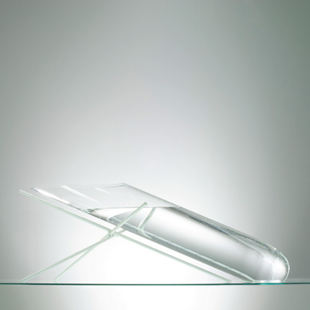この水槽は曲線部分を併せ持つガラス製で、金属製のパーツが水槽の傾斜ラインの中央をはさむ構造となっています。エアーシリーズの他の作品同様、「エアー3」も実験用ガラス器具の特性を生かして制作されました。スタンドに支えられながら空中で傾斜を保つ「エアー3」は、「重力」と「高度」をテーマに掲げています。