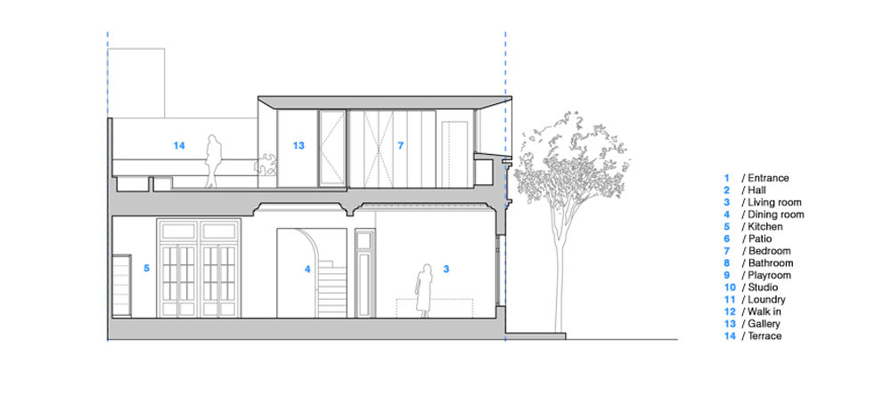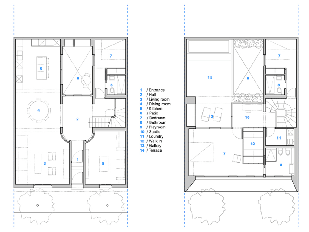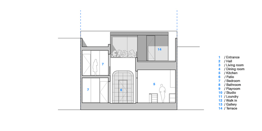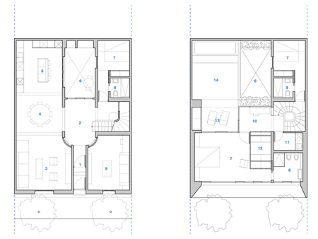 この家は通の歩道に面しており、このような通りは種類の数少ない都市副システムのひとつで、ほとんど変化することなくそのままの状態にあります。通りはタウンハウスの並びによってかたち作られ、それぞれの建物は似かよった構成をしています。奥に位置する室内パティオが単純な間取りを3つの特有の広々とした空間に分けています。何年もの月日を経て、これらの何件かの家々は新たな階が建て増しされたり、既存のテラスがベッドルームや洗濯室またはプレイルームといった新機能に対応するように改築されてきました。