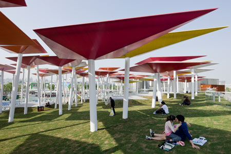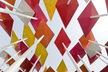 このパビリオンは凧のような形をしたエレメントが傾いた白いポールの上にのっかり、傾斜した敷地に整然と並んで来場者を大広場に導くように計画されているのが特徴である。