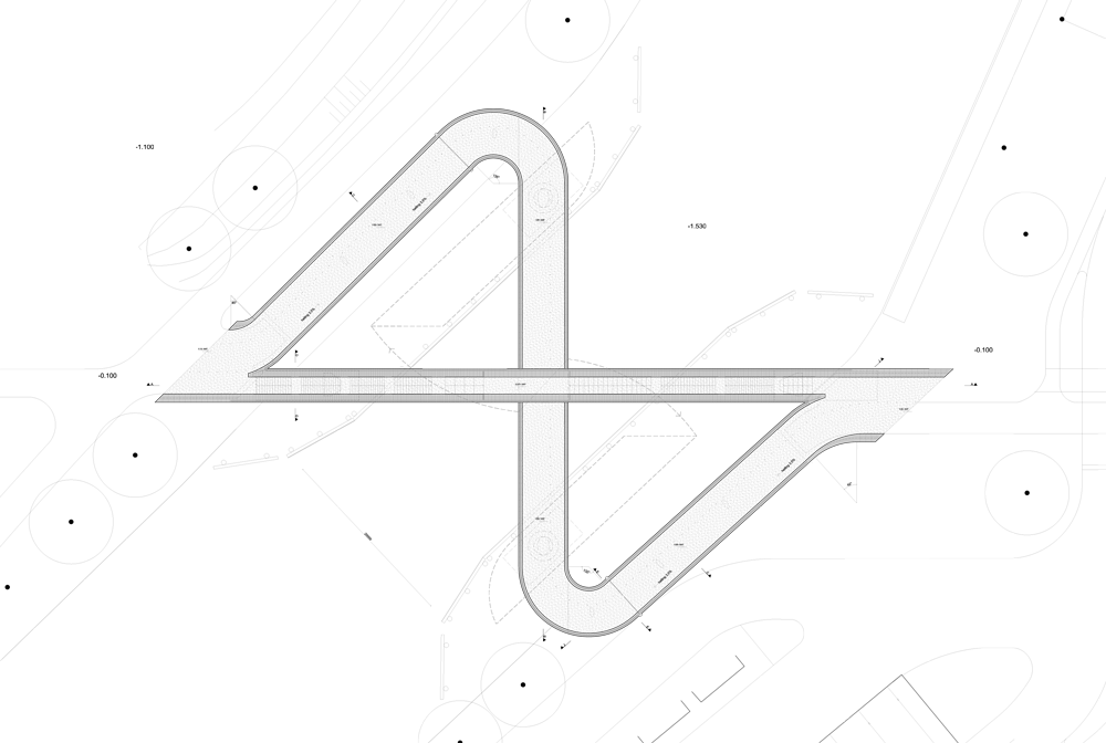 ゆるやかな傾斜度を維持するための十分な長さを確保するため、自転車用通路は曲がりくねった構造となっています。