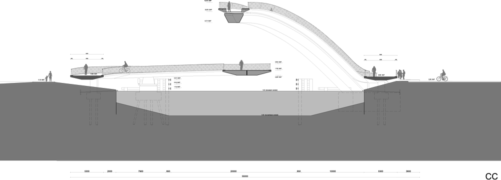 歩行者はアーチ型の橋を渡りその最高地点から周りの景色を楽しむことができる。高さの異なる川の両岸を緩斜面で結ぶ自転車・車椅子用通路は、必要な長さを確保するためジグザグ構造となっている。