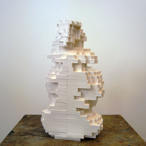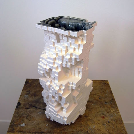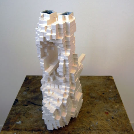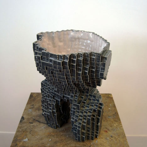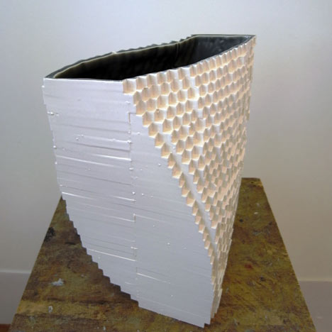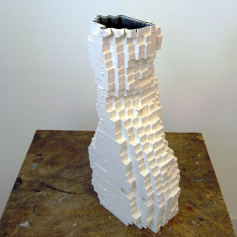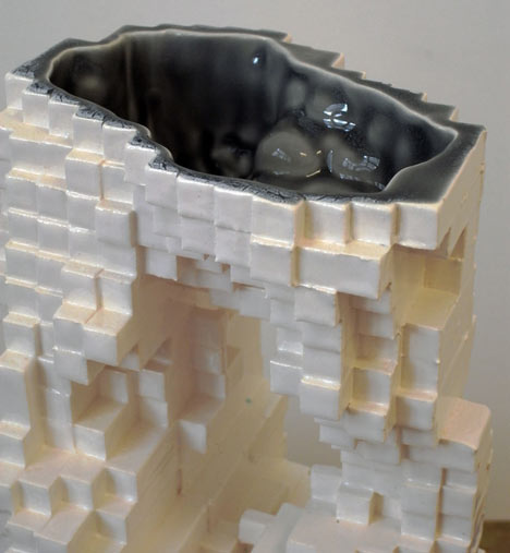 Pixel の花瓶は漆喰の棒がそれぞれ1300以上でできている型を使用しています。この棒はそれぞれ動いて独特の型を作り、通常の固定されているスリップキャスティングの型とは異なります。