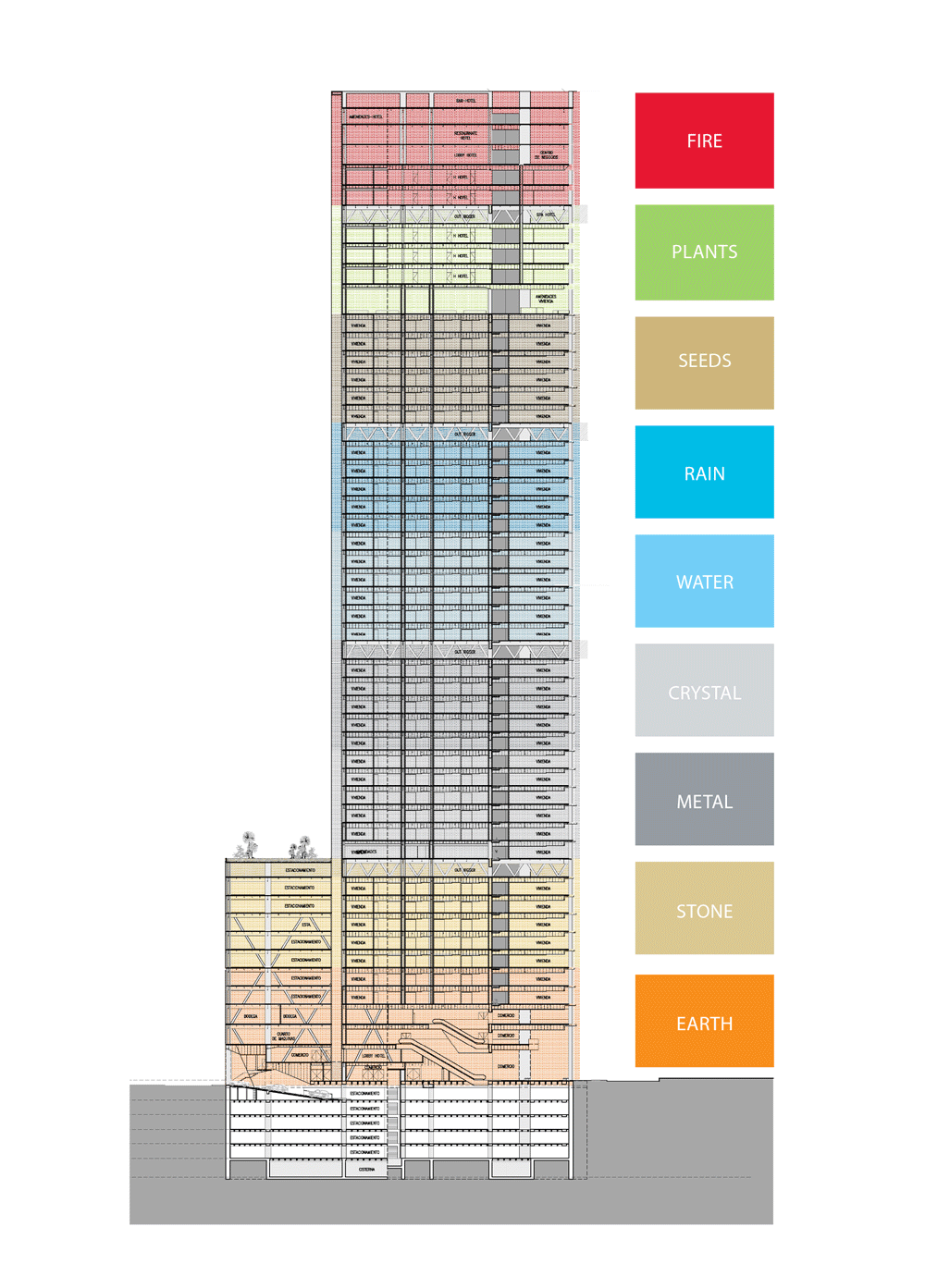 この高層建築は階や区域ごとに分けられ、それらはガストン・バシュラールの『物質的想像力』を基にしたテーマとも言える自然界の要素によって、地上部から「地」「石」「金属」「水晶」「水」「雨」「種」「植物」「火」というように、異なった色、素材、匂い、そして音を表していきます。