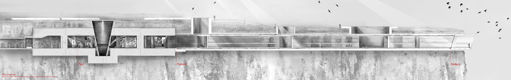 反映と回想:この展望プラットフォームでは来館者が海を見ながら体験を通じて収集した情報について深く考えます。この空間は部分的に露出されているので、来館者は鳥のさえずりなど聞きながらある種の開放的な感覚を持ち始めるでしょう。