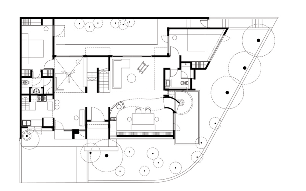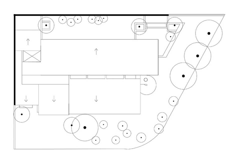 低い生け垣の刈り込まれた庭を設けるよりも、家主は代わりに大木を植えることを好みました。それらの木々は一日のある一定の時間内に特に必要とされる場所(特にガラス窓が床から天井まで占めている場所)に日影をつくるように庭面に戦略的に配置されました。