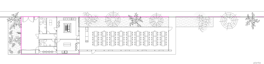 黒板壁は教室から食堂を分離し、取り囲むマジェンタ色のアルミメッシュのフェンスが学校の新旧部分を調和させている。