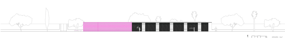 新築の妨げとなったので両方の樹木が移植された自生の芳しい植物の生える庭は、サービス用の中庭と学校へのアクセスのぶつかりを調整します。