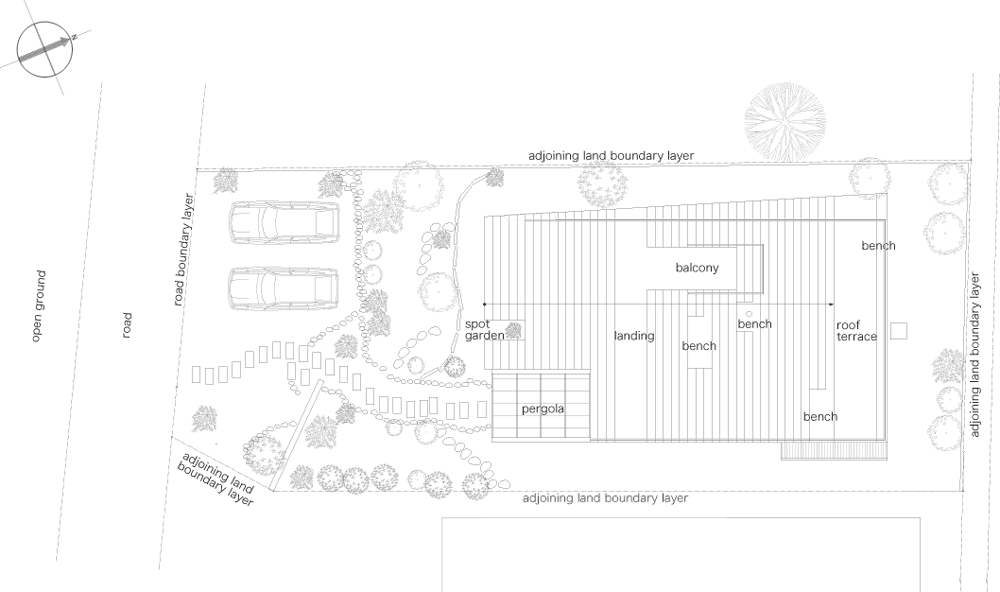 外部構造が庭と屋根をつなげ、家の内部は私的空間であるポーチ/入り口/ラウンジエリアと寝室をつなげています。窓はプライバシーを保ちながらも、できるだけ自然光を取り入れるように設計され配置されています。