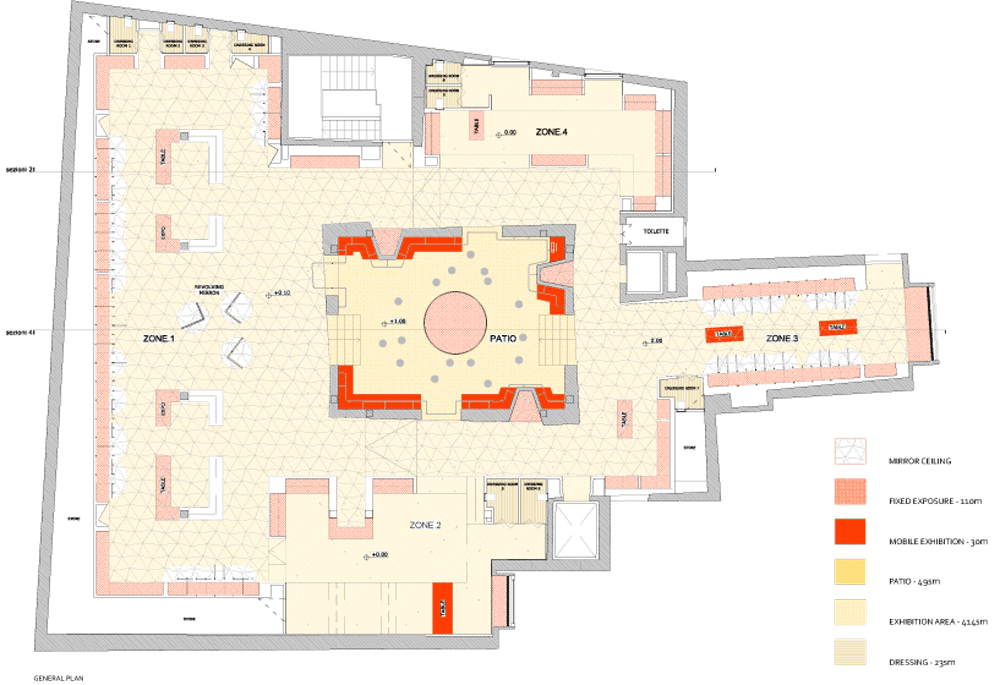 中央の丸テーブルが下層のメインホールの天窓として機能する中央の高くなったパティオは、遠近感覚と錯覚の組み合わせによって、青色がその他へ入り込みながら、周囲の空間を変化させます。