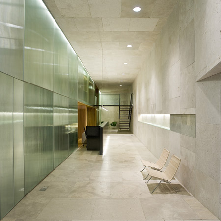 夕刻になると強く降り注ぐ西日のような無形の輝く光がこの建築には必要でした。それは「明るい昼間」と「暗い夜」という変化する2つの環境の狭間に横たわる光のフィルターとなっています。上下階を結ぶ階段は、この土地伝統の石でできており壁から突き出たようなデザインです。それはまるで空中に浮かんでいるようで、意外性と変化に富んでいます。