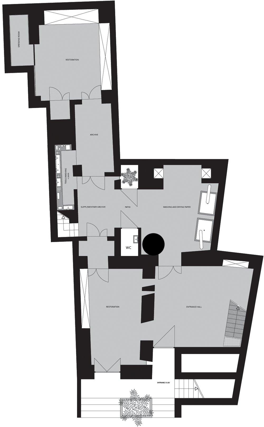 プロジェクトの最終段階は、紙の処置室(洗浄と乾燥)、科学的な研究・分析室、修復作業の準備のための部屋、記録保存所、図書室、道具を洗うスペース、スタッフの更衣室を設けることでした。まず、歴史的構造的観点から見て支障のない部分を全て取り壊しオリジナルの構造を回復させました。光による反射の効果を高めるために内装には白色を使いました。既にある開口部と階段はそのまま利用して、スペースをできるだけオープンな状態にしました。