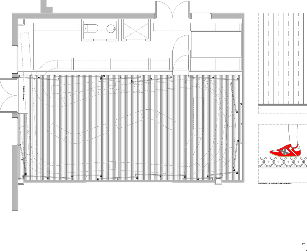 床は亜鉛めっきされたスチール製です。什器も全てベルトコンベヤーのローラーで作られています。