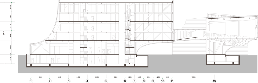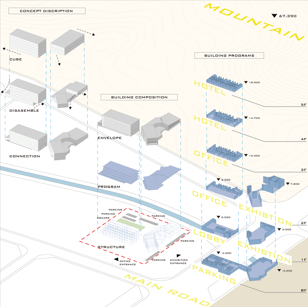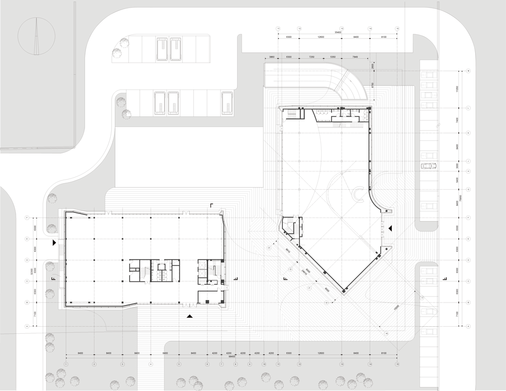 西側は5階建て・高さ23.1メートル・延べ床面積5.500平方メートル、東側は2階建ての展示会場で高さ18.45メートル・延べ床面積2.800平方メートル、公共広場は780平方メートルで地下に3.200平方メートルの駐車場を備え、そこから東西両方の棟にアクセスが可能です。